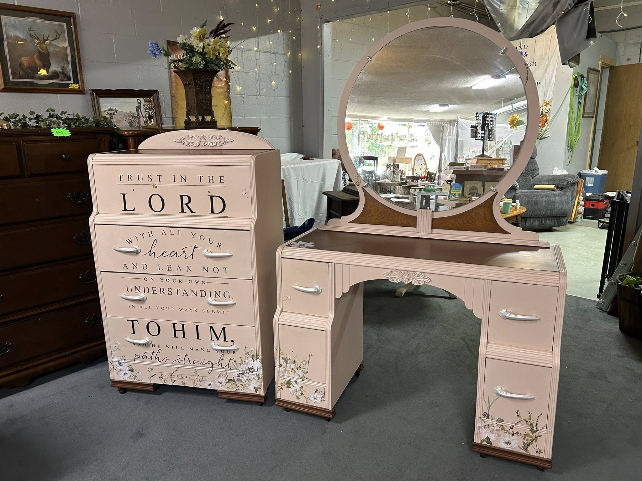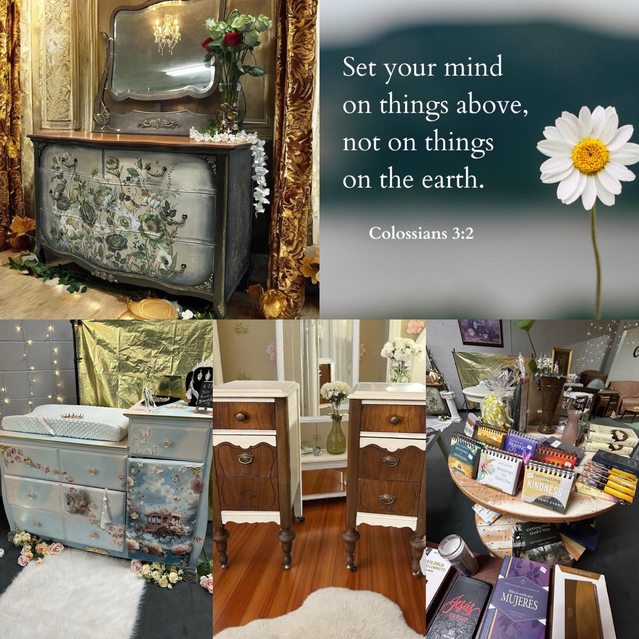 We are your local Bible bookstore and Thriftique -specializing in amazing hand-painted furniture, home decor, clothing, jewelry, & much more! Store hours are W-F, some Saturdays, 10-4. Message anytime to see if we’re here! We look forward to seeing you:)